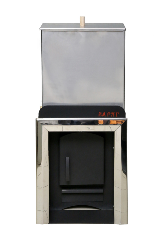 Варяг Пересвет 16 с выносным тоннелем относится к классу банных печей «Топи и мойся», так как в комплекте идет бак из нержавеющей стали объемом 45 л., установленный непосредственно на саму печь.