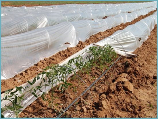Под плёнкой грядки прогреваются быстрее, значит стоит обтянуть теплицу плёнкой. Чтобы сохранить внутри комфортную температуру используем натянутый на дуги спанбонд или просто укрываем им растения сверху. Ведь плёнку на вегетирующие растения не набросишь — задохнутся и сгорят.